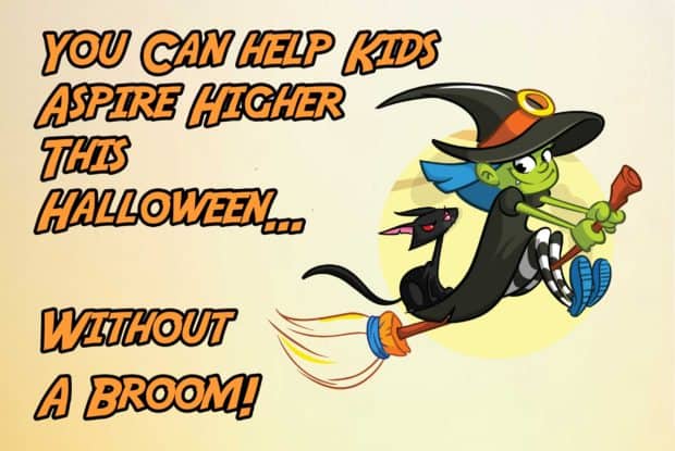 Help Kids Aspire Higher This Halloween Without A Broom. Now is the time to print up your gift cards, free passes, Halloween treats or whatever you want to call them and get them in the hands of all your students and parents with a request that they help distribute them to Trick or Treaters on Halloween night.